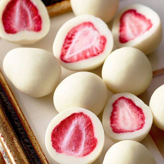 フリーズドライのサクサク苺とホワイトチョコが絶妙なハーモニーで、フルーツ本来の甘酸っぱさが際立つ一粒に。
