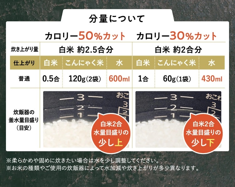 白米の量でカロリーが変わってきます。「カロリー50%オフ」と「カロリー30%オフ」の分量は次の通りです。