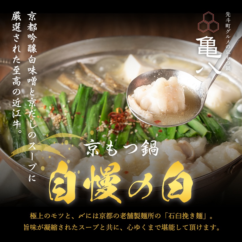 中でも定番商品の「自慢の白」は、近江牛のもつから出る旨味と厳選された食材から出るスープの旨みは、 あっさりでありながらもまろやかで、最後の1滴まで飲み干したくなる極上の逸品です。 もつの旨味、京都らしいスープの味わい、 お野菜の美味しさが織りなす味の三重奏をぜひお楽しみくださいませ。