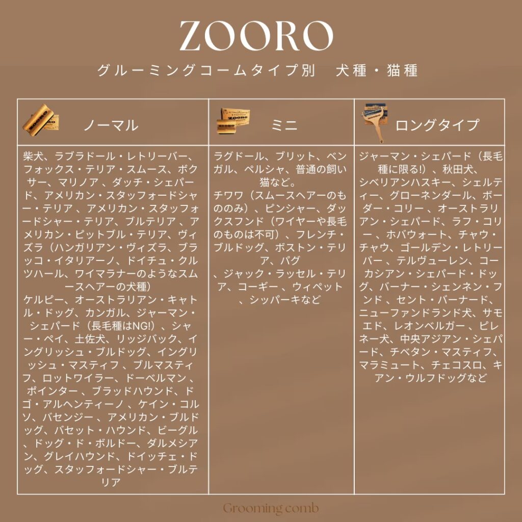 ゾログルーミングコームの種類は「ミニ短毛用」と「ノーマル短毛用」と「ロング長毛用」の3種類。