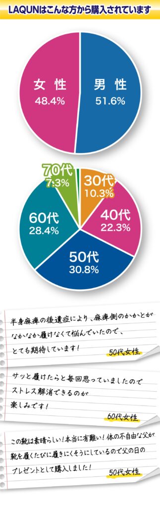 「LAQUN(ラクーン)」は、男女関係なく、30代~70代の方に良く使われています。1秒で楽に履けるのが人気となっています。また、プレゼントとしても喜ばれています。
